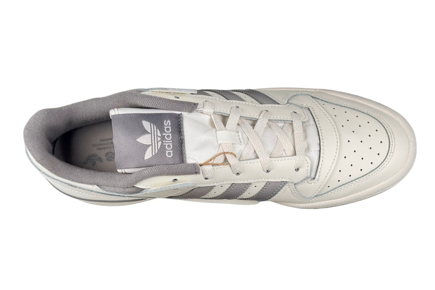 Underfoot, the off-white EVA midsole carries the “adidas” wordmark on the lateral side, and the grey rubber outsole runs the classic Forum herringbone and circle tread pattern — engineered for basketball courts, proven on every surface. The Trefoil logo appears on the tongue tag, lateral panel, midsole, and outsole, leaving no question about the heritage behind this silhouette.