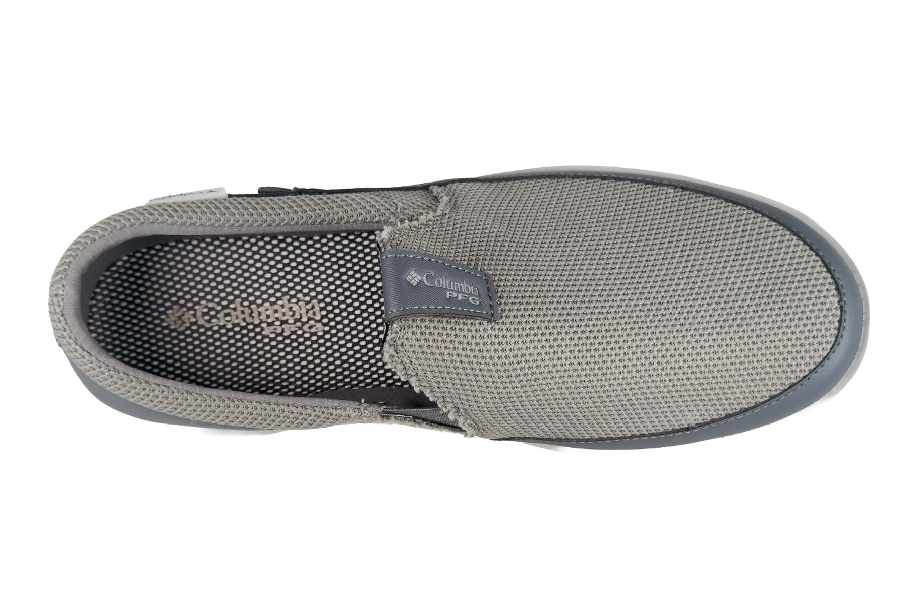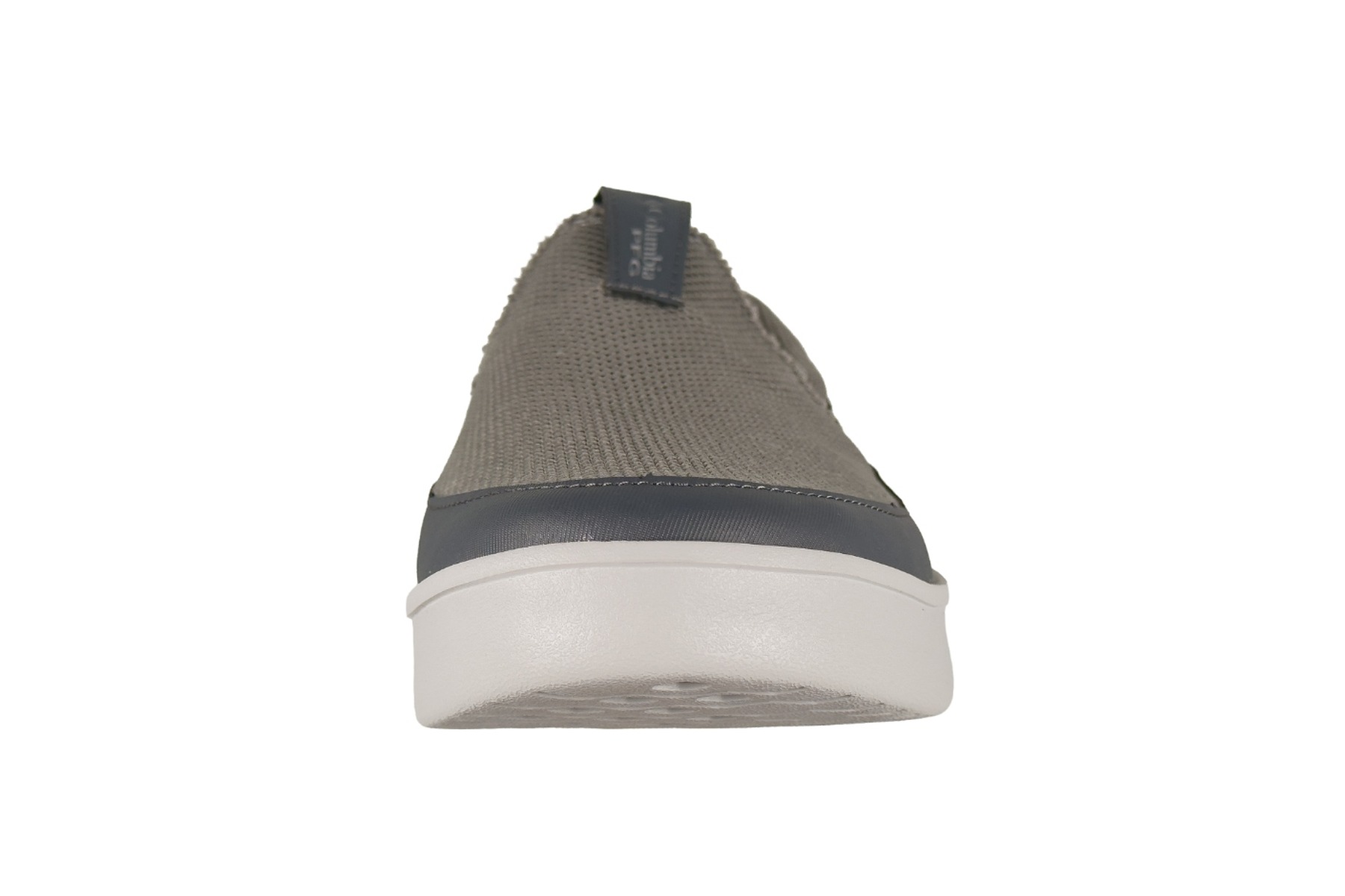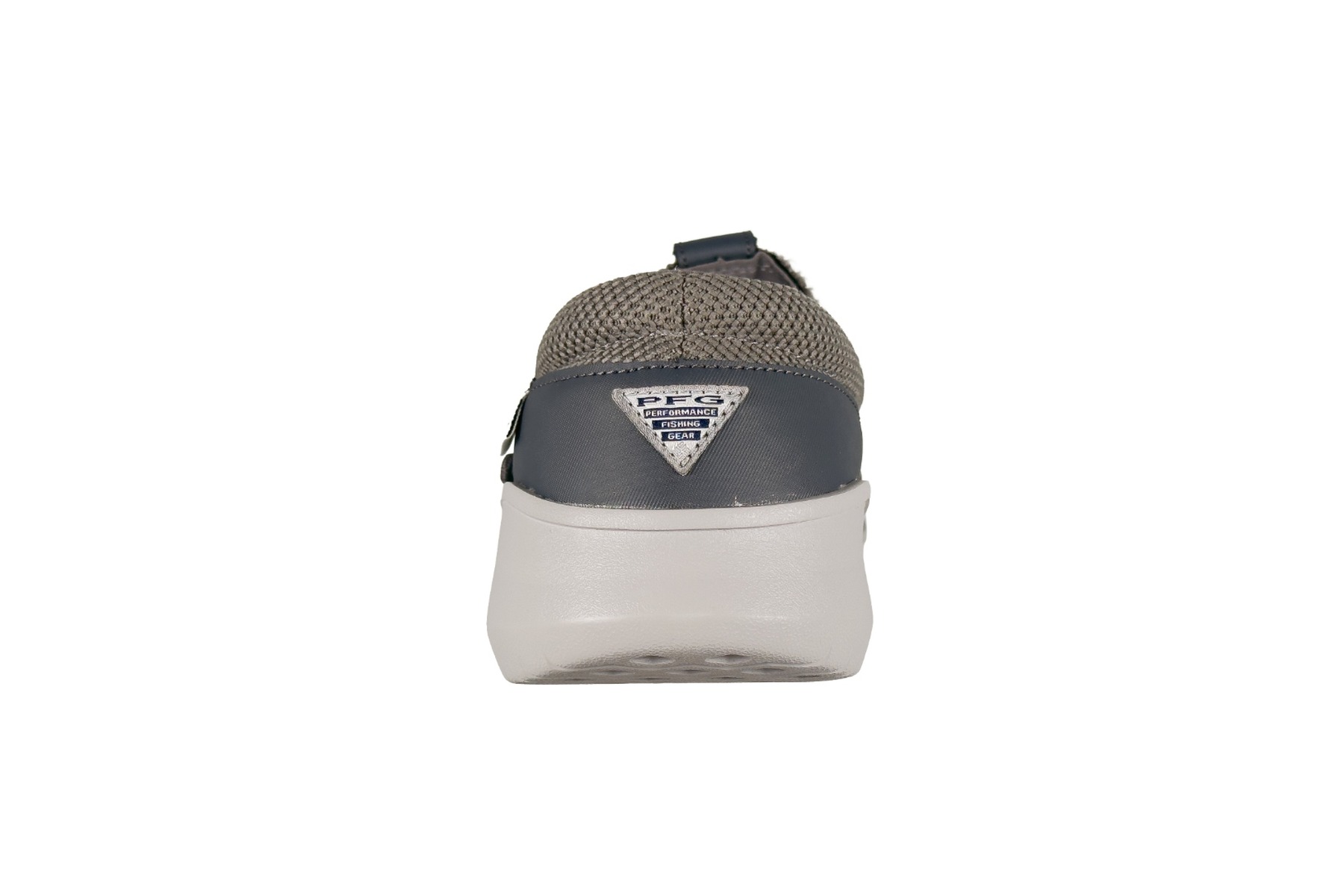The upper blends a warm grey open-weave textured knit mesh across the vamp and heel collar with smooth slate blue synthetic panels at the toe cap and quarter. The contrast between the warm grey mesh and cool slate blue overlays gives this colorway a refined, nautical look that transitions seamlessly from the dock to the street. Entry is completely lace-free — an elastic gusset panel at the midfoot flexes for easy slip-on access, while a grey cord heel loop assists pulling. The Columbia PFG woven badge sits on the lateral quarter, and the PFG Performance Fishing Gear triangle badge is embossed on the rear heel counter.