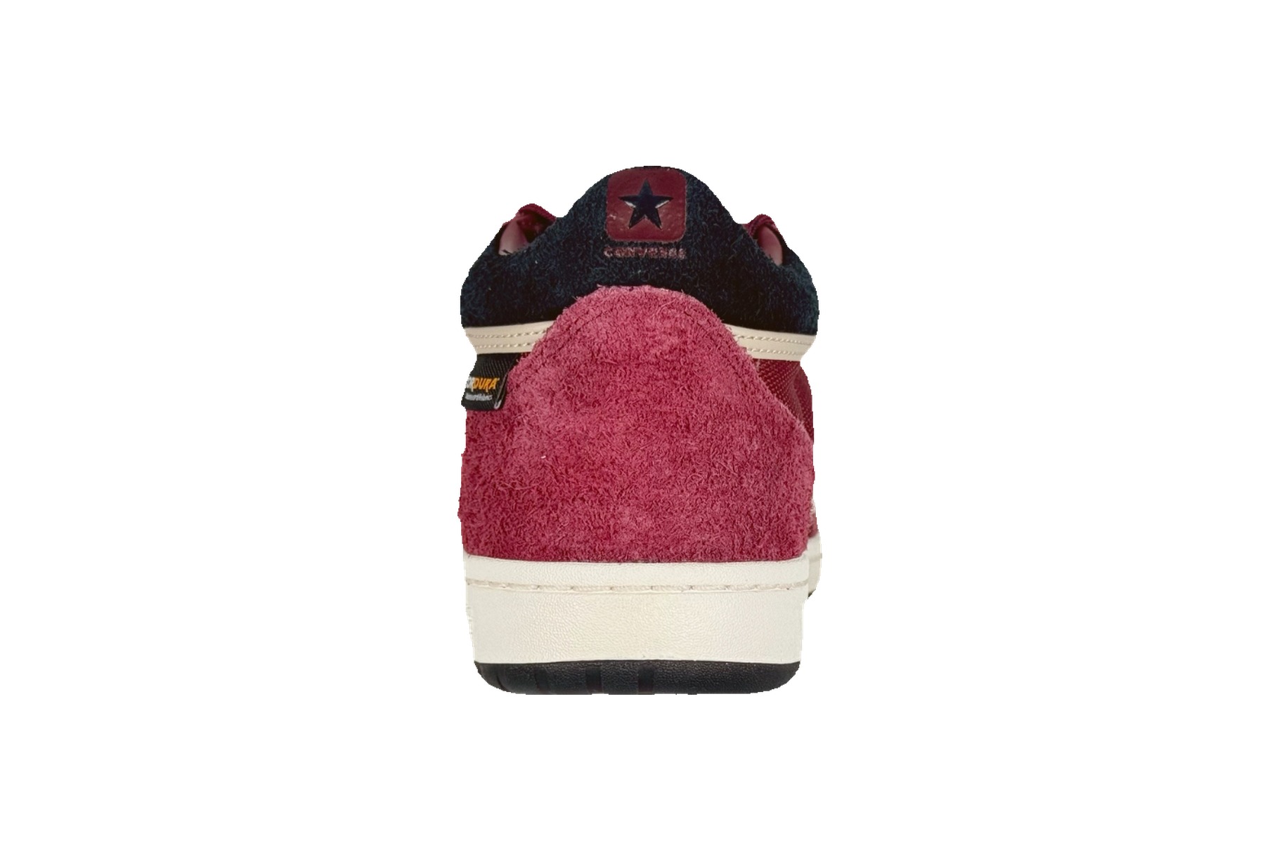 The off-white Egret midsole is medium-profile with “CONVERSE” debossed on the lateral face, sitting above a black rubber outsole engineered with multi-zone traction: a star-patterned herringbone field at the forefoot transitions into zigzag chevrons at the midfoot and triangular heel pods at the rear. A woven CORDURA® branding label is sewn at the rear ankle — a rare detail that signals the premium material spec to those who know.
