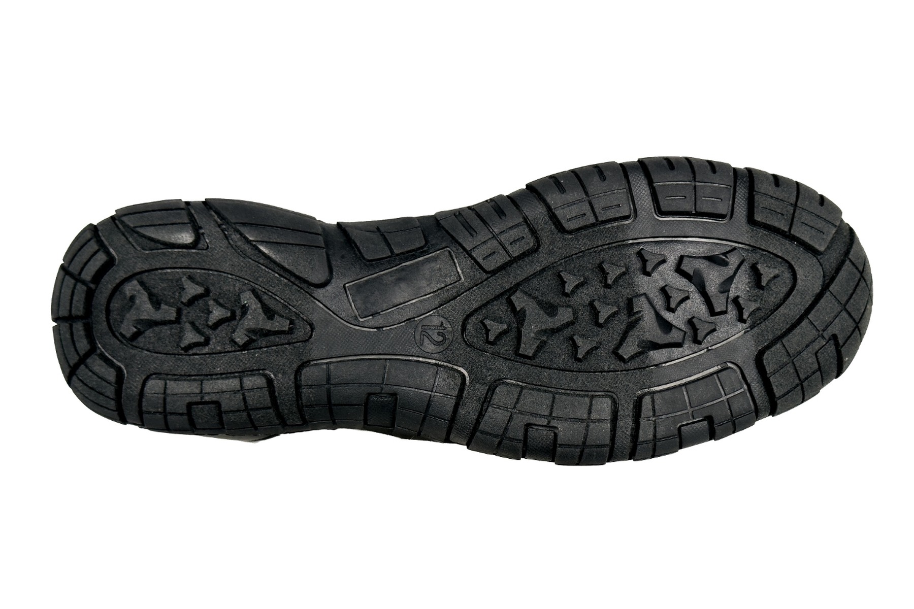 | Outsole | Black rubber, multi-directional lug pattern (star pods + rectangular blocks) |