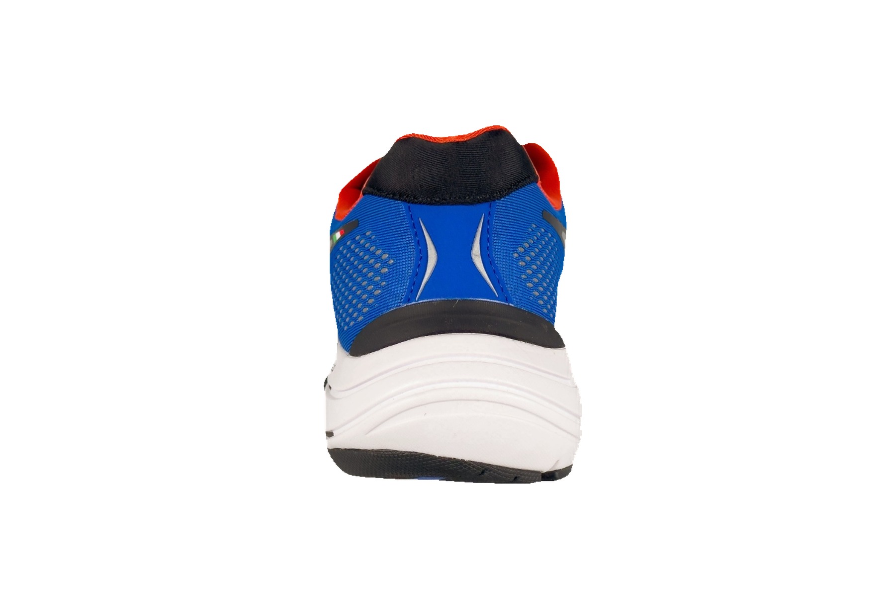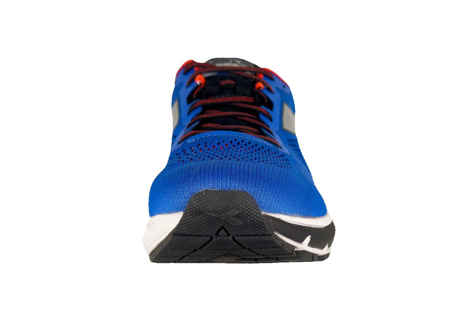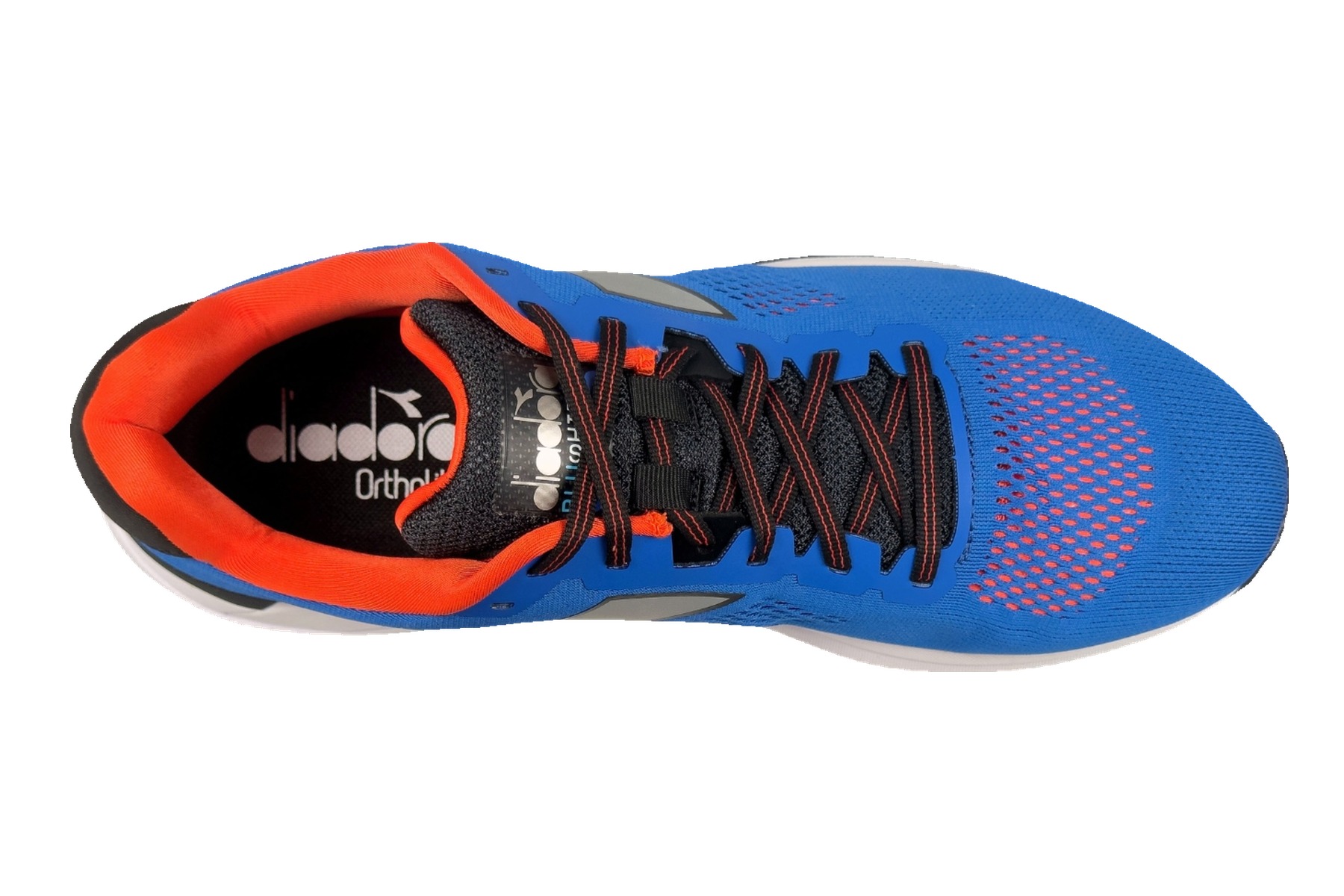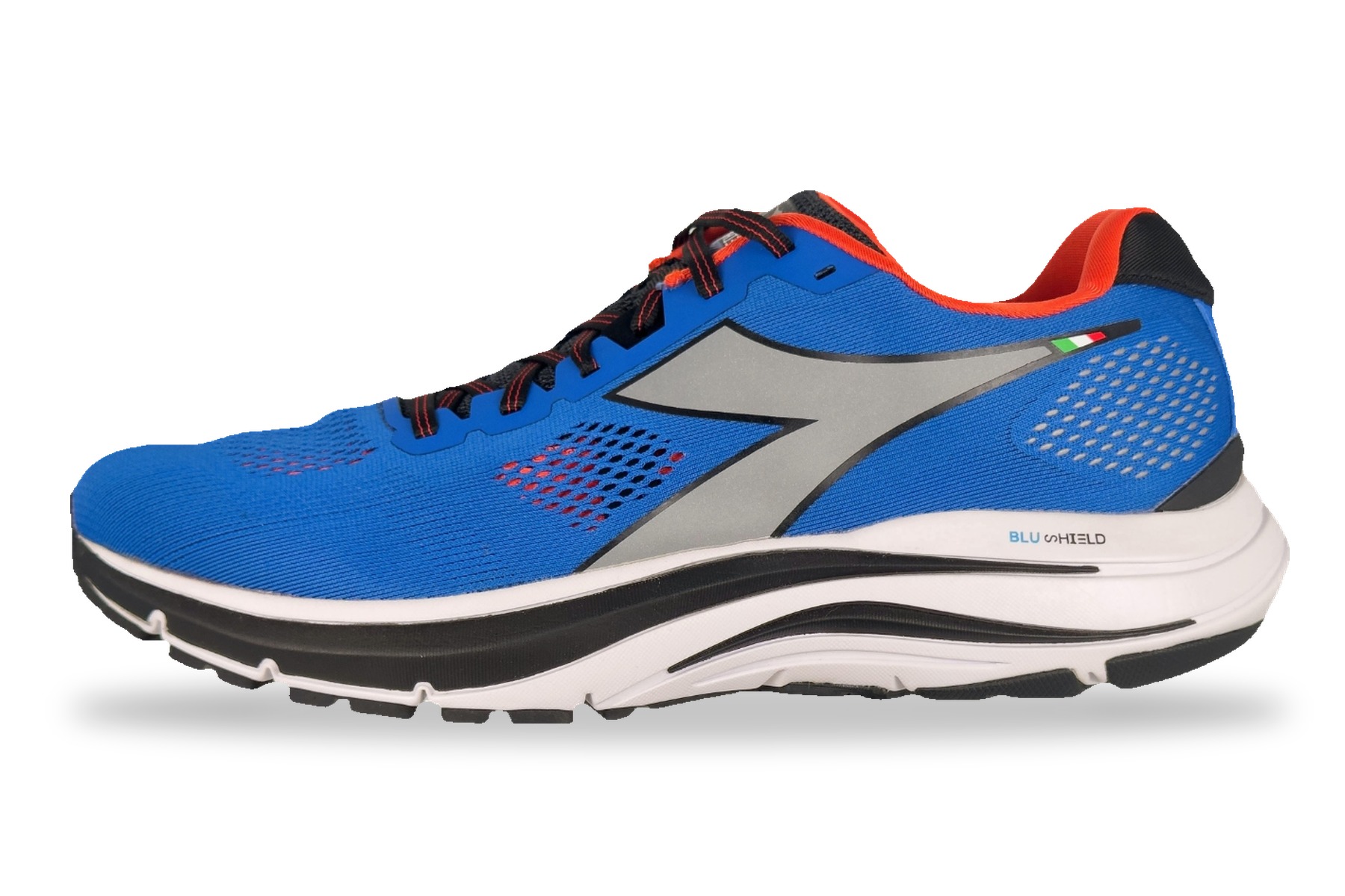 The upper is constructed from a lightweight engineered mesh with multi-zone ventilation that keeps feet cool and dry even on warm-weather runs. A structured heel counter locks the foot securely in place for stability during push-off. The bold royal blue colorway is punctuated by silver reflective Diadora logo overlays and vivid orange accent details — with an Italian tricolor flag detail on the heel — a subtle nod to the brand’s roots.
