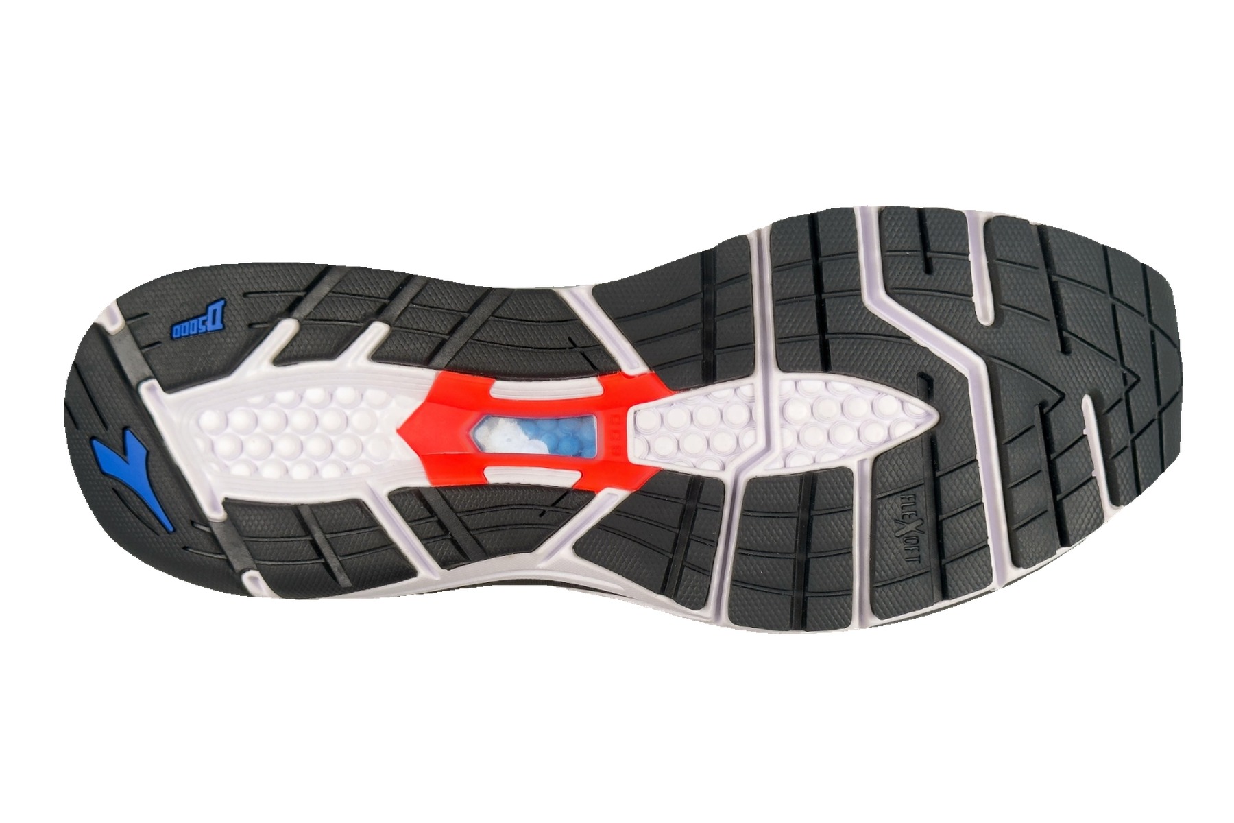 The D5000 high-abrasion rubber compound is one of Diadora’s most durable outsole materials. Expect 400–500+ miles of road running before significant wear.