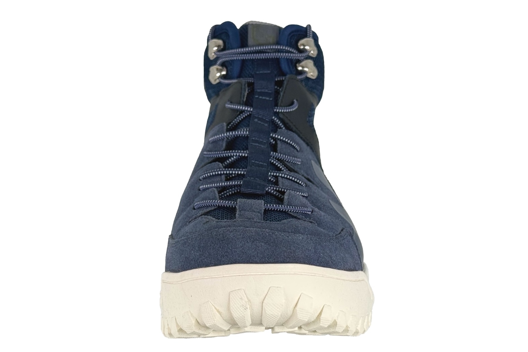 This Squill is in a Blue / Navy / Off-White colorway — navy blue suede at the toe and sides, dark navy mesh and pebbled leather at the high collar, smooth blue leather overlays at the midfoot, and a chunky off-white lug midsole and outsole.