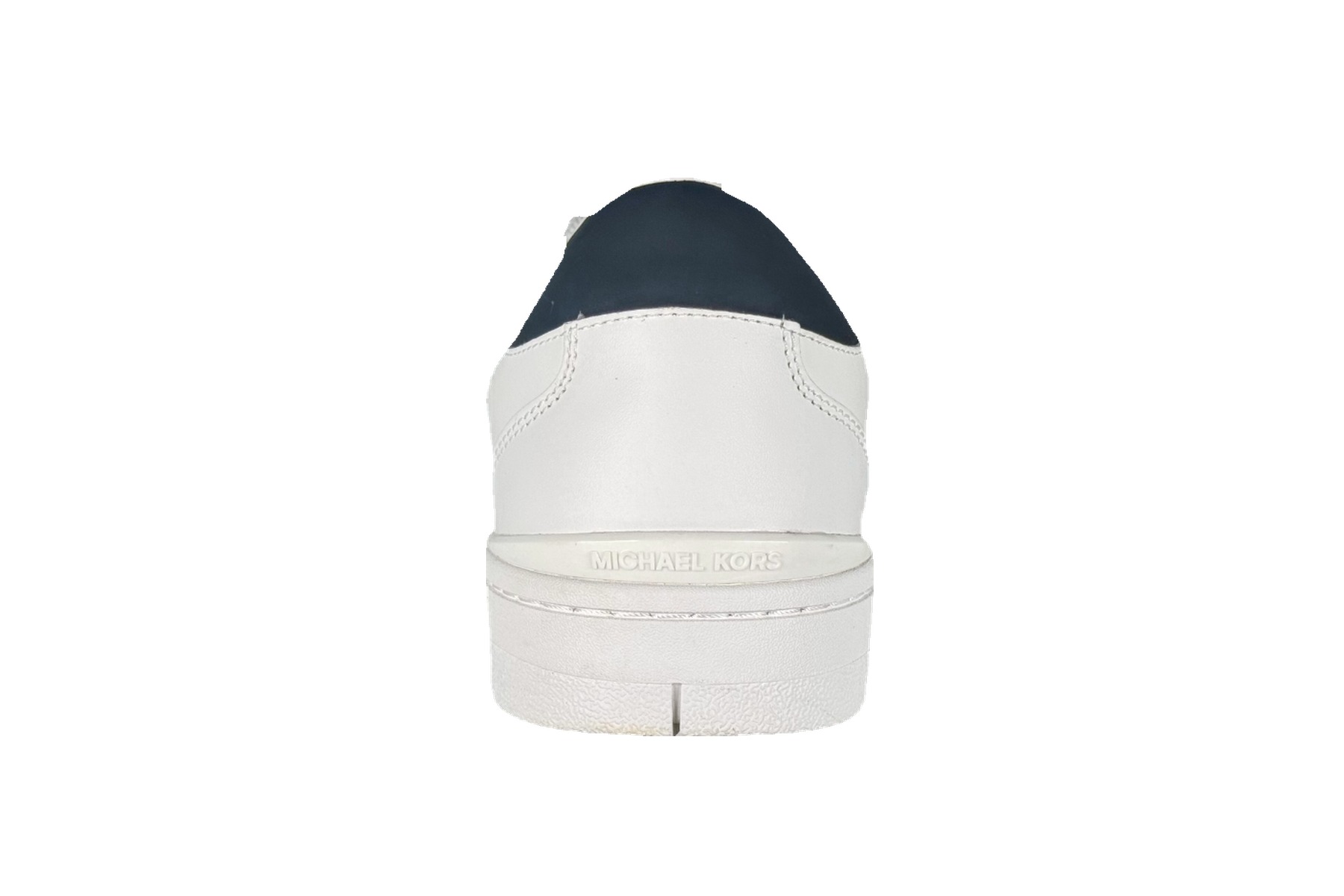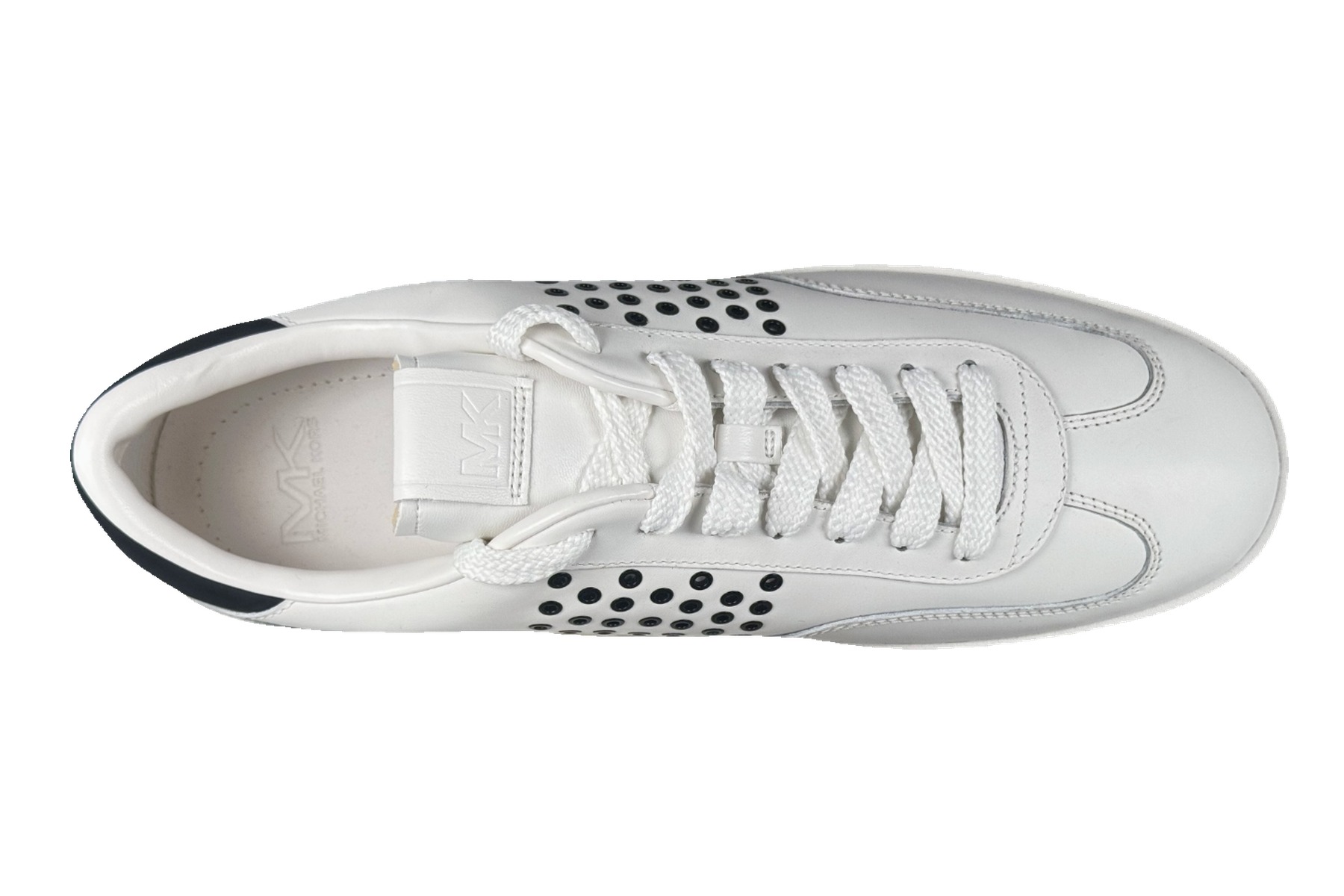 The upper is crafted from smooth full-grain white leather across the entire vamp, quarter, and toe cap — no canvas, no mesh, no mixed materials. The construction is clean and panel-free except for the grommeted accent zone, which uses black metal studs set into the leather to form a bold graphic that reads as the MK monogram shape from a distance. A navy leather heel counter tab provides the only colour accent in the palette, keeping the overall look restrained and sophisticated. The interior carries the MK monogram logo on the collar lining.