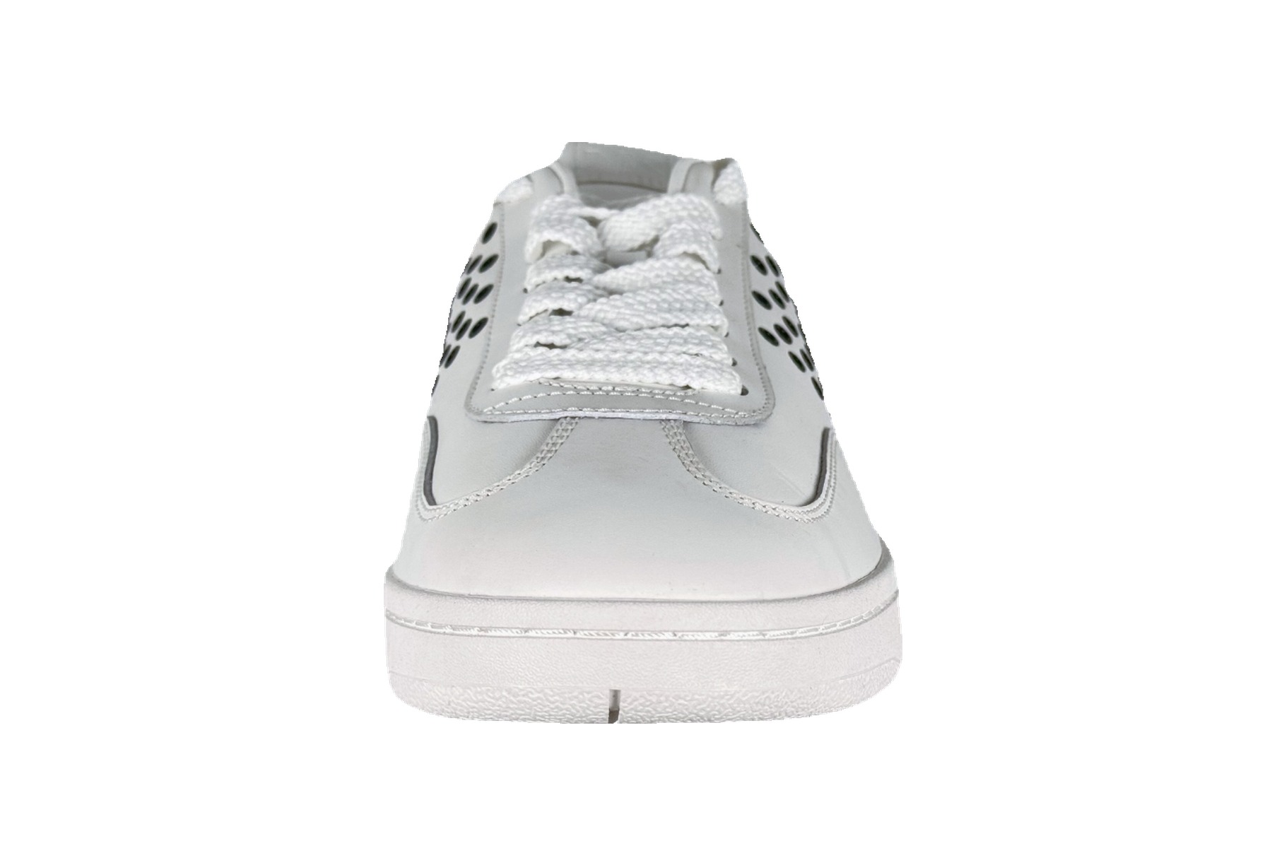 | Upper | Smooth full-grain white leather with black grommeted stud detail; navy leather heel counter |
