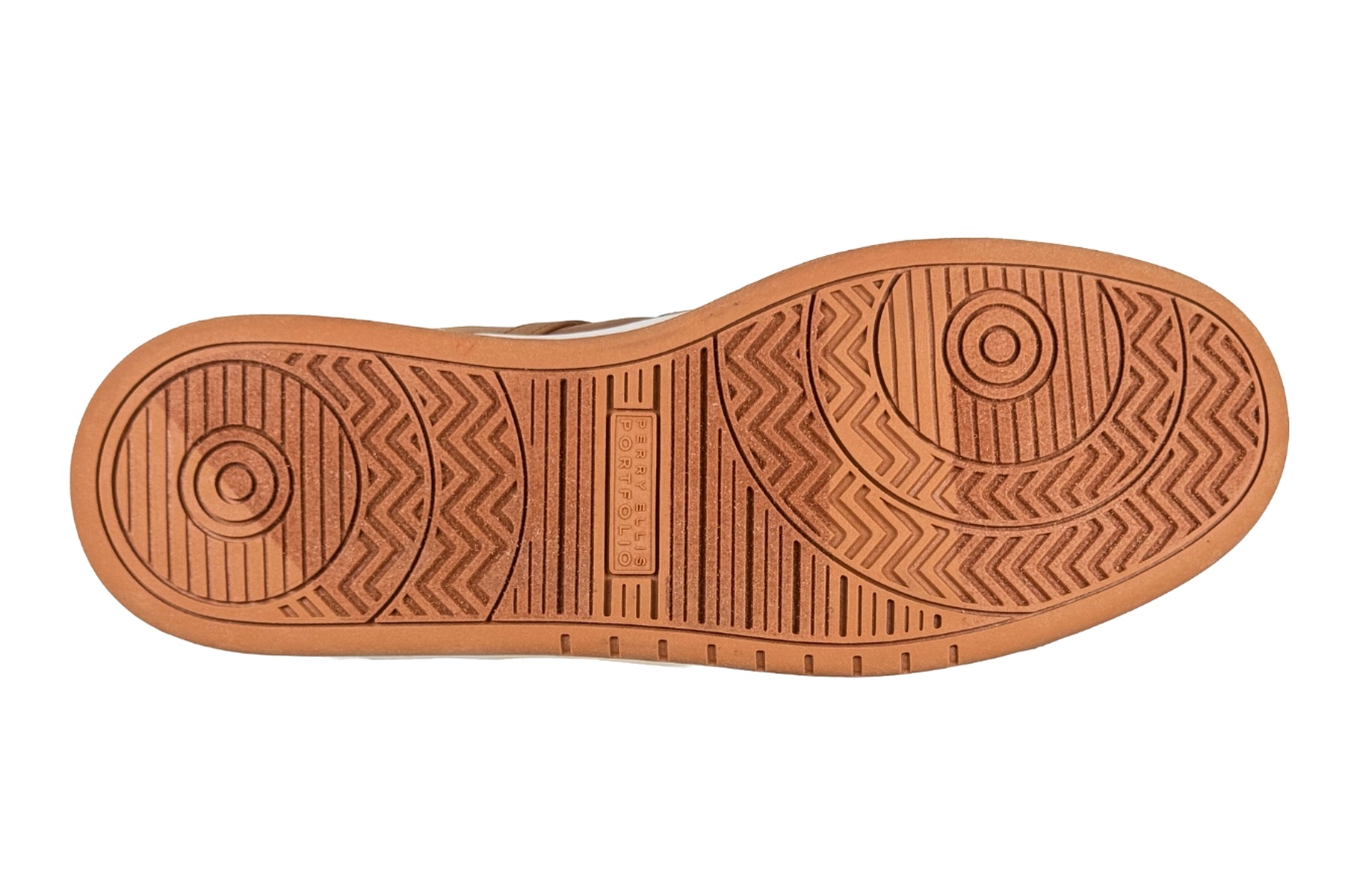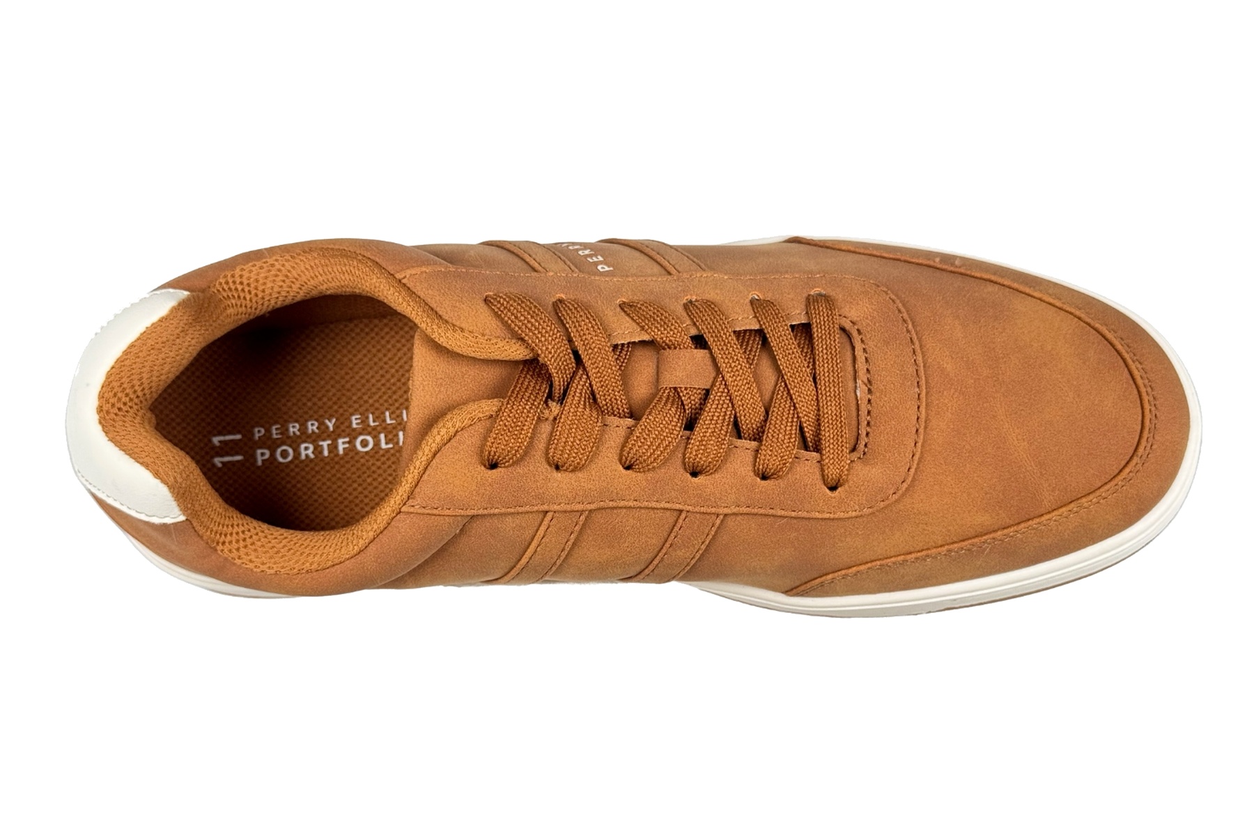 Perry Ellis Men’s Classic Lace-Up Sneaker in Brown. Premium nubuck leather upper with triple-stripe detailing, Perry Ellis script branding, and tan gum rubber outsole. Size 11 — was $120.00, now $46.99 (61% off). Brand new, free shipping.