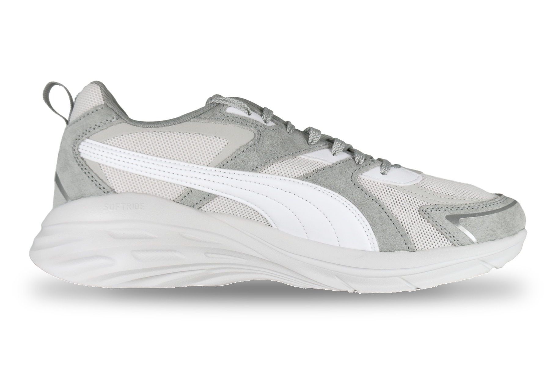 - SoftRide Midsole — Puma’s all-day cushioning platform — sculpted, wave-ribbed white foam with dramatic heel stack for maximum comfort