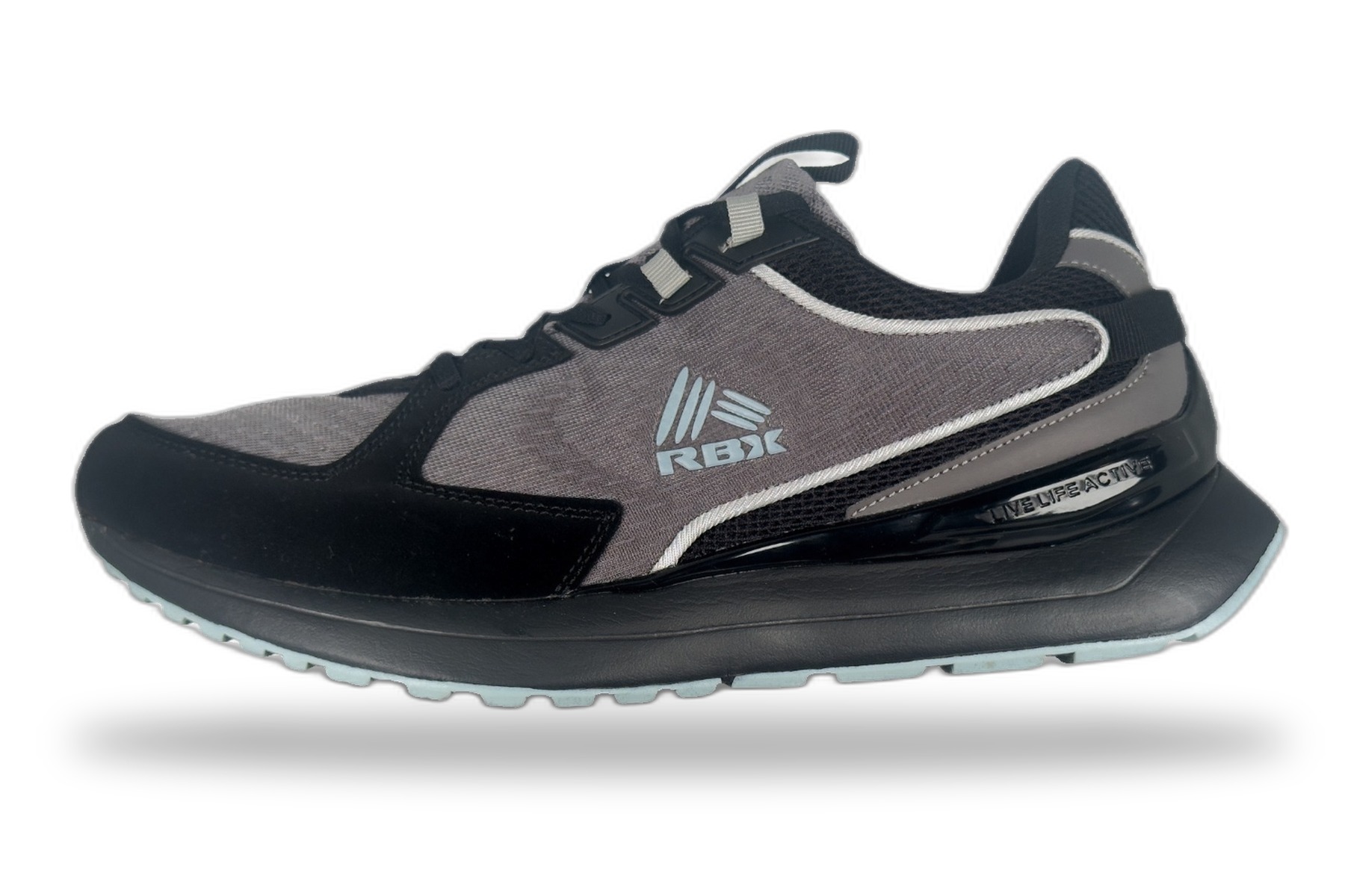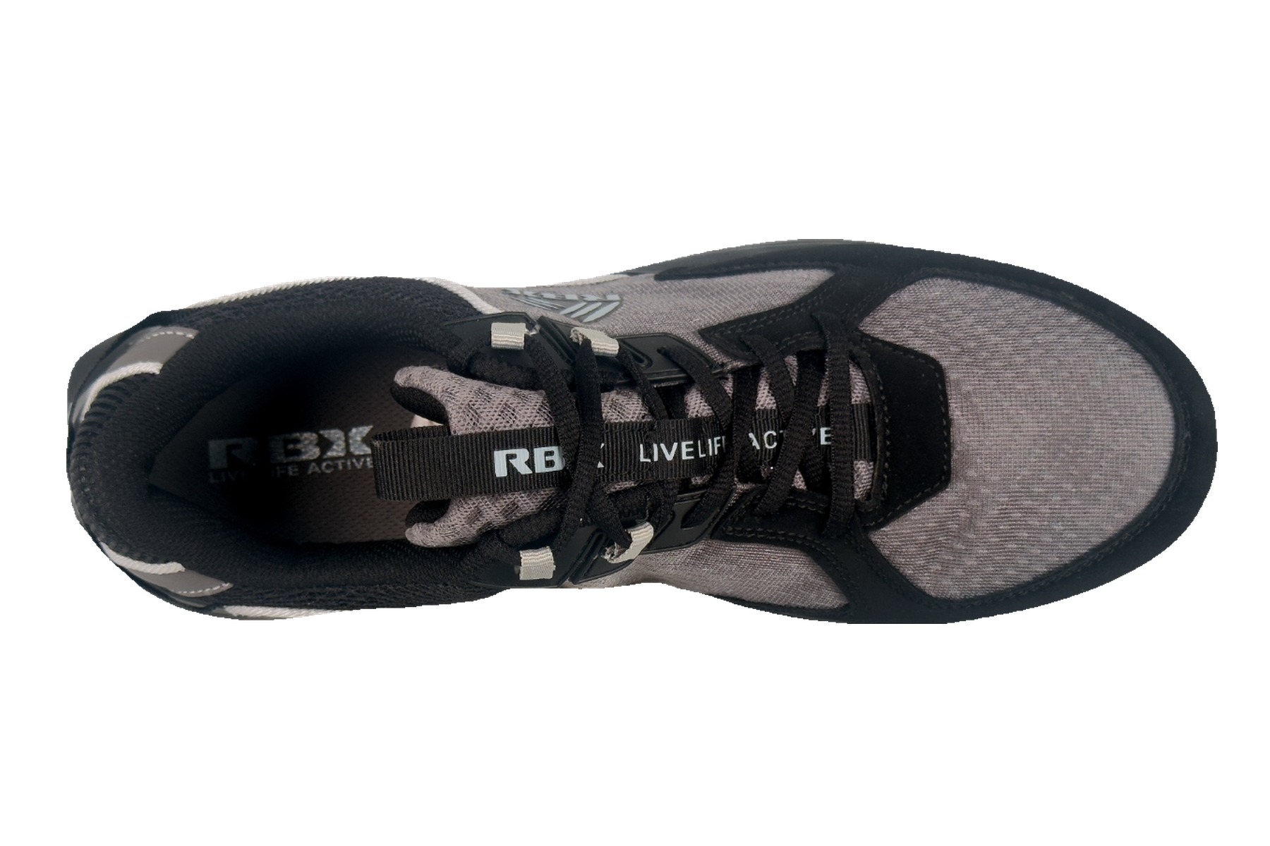 The upper builds across three distinct zones. A heathered charcoal grey engineered mesh — with a subtle linen-like cross-weave texture — covers the full vamp and midfoot, giving the shoe a refined, elevated look compared to standard plain mesh. Black open-weave mesh at the heel collar and toe box adds breathability and tonal depth. Black smooth synthetic overlays at the toe cap and heel counter structure the most critical zones, and a glossy black patent-look panel wraps the lateral midsole/upper junction — a premium detail that reads as more expensive than the price point. The RBX peak logo on the lateral vamp is printed in ice blue-grey to match the outsole, and “LIVE LIFE ACTIVE” is debossed into the black midsole wall. A bold woven “RBX” strap at the heel collar and “RBX LIVE LIFE ACTIVE” lace garage on the tongue complete the branding.