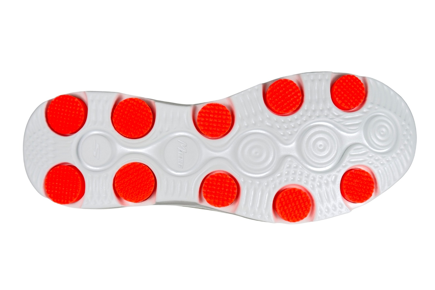 - Red-Orange Traction Pod Outsole — 11 circular rubber traction pods with M•STRIKE stamp provide multi-surface grip and forefoot flex