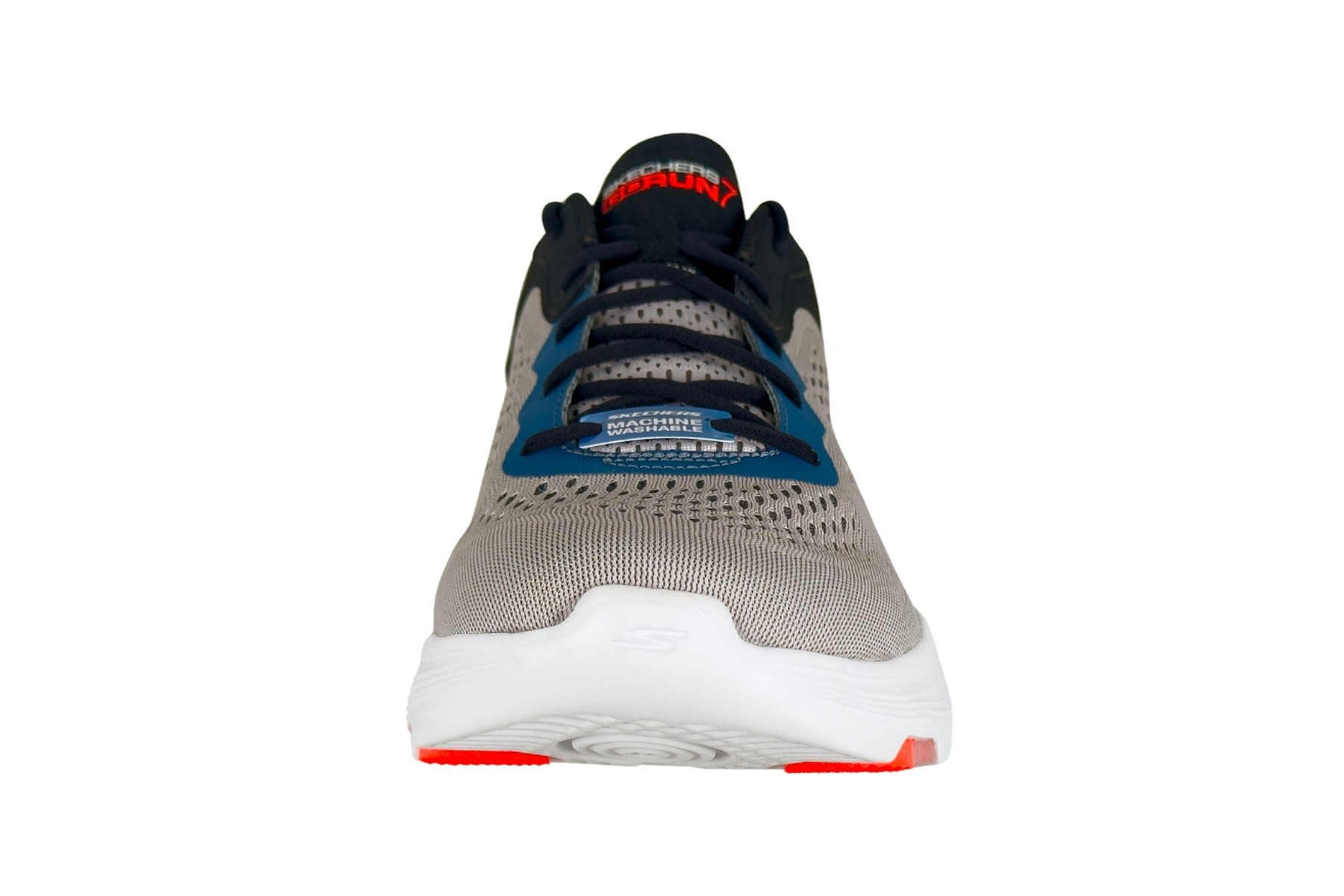 The upper is built from a perforated engineered mesh in light grey with dot/hex ventilation holes throughout the forefoot and midfoot — maximizing airflow on long runs. Navy and teal-blue overlays reinforce the collar and heel counter while a coral/red-orange “S” logo sits at the midfoot. The “SKECHERS GORUN 7” tongue label and “MACHINE WASHABLE” hangtag confirm this shoe is designed for easy maintenance — just toss it in the wash.